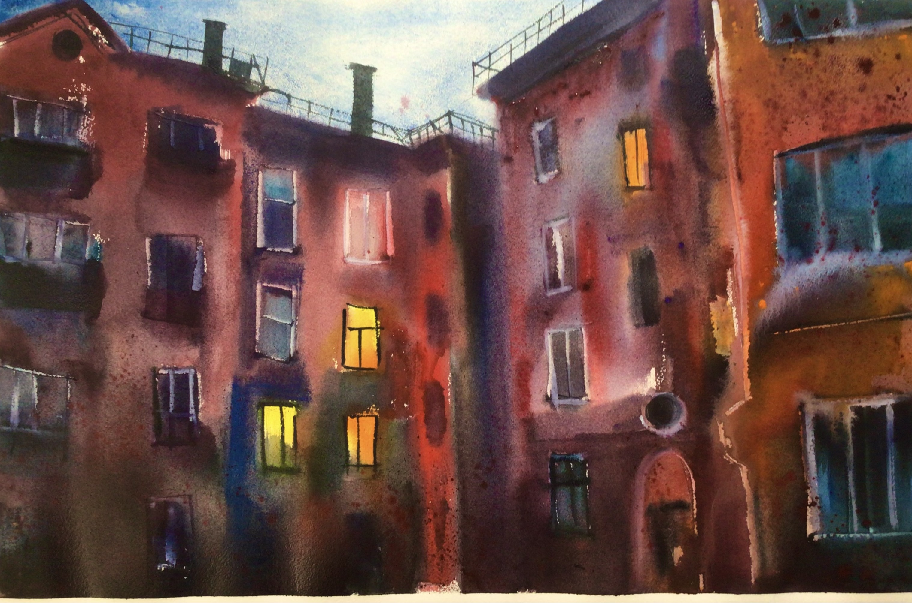 Ночные окна, Клишевская Светлана, Акварель, бумага, 2025 , 38x56